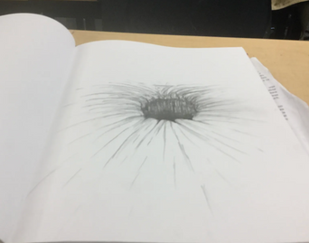 Various hand-drawn pieces range from quick studies to detailed compositions, showcasing diverse techniques like observation, abstract interpretations, pinhole images, and characterized life drawings.